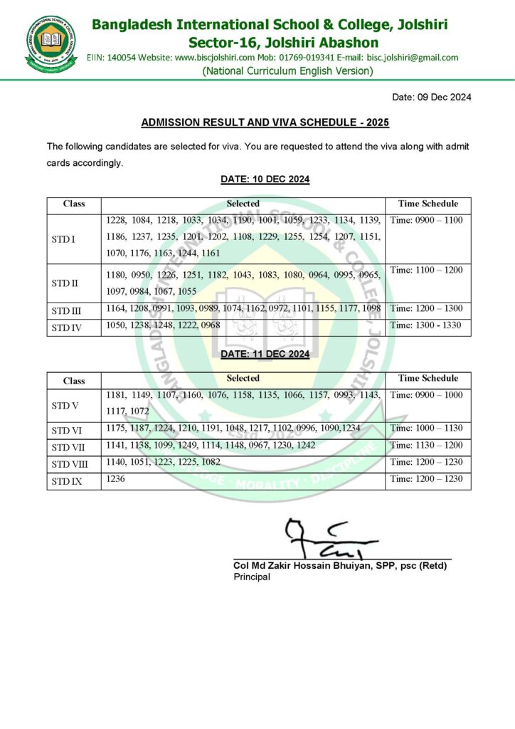 Admission Test 2025 Result STD-I to STD-IX