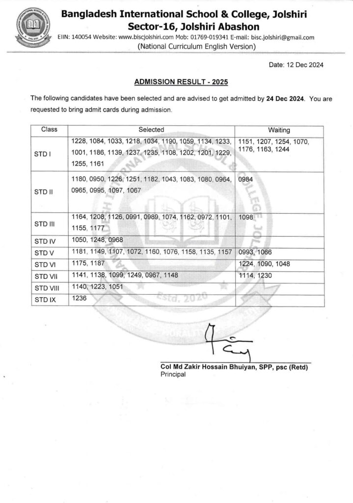 Admission Test 2025 Viva Result STD-I to STD-IX